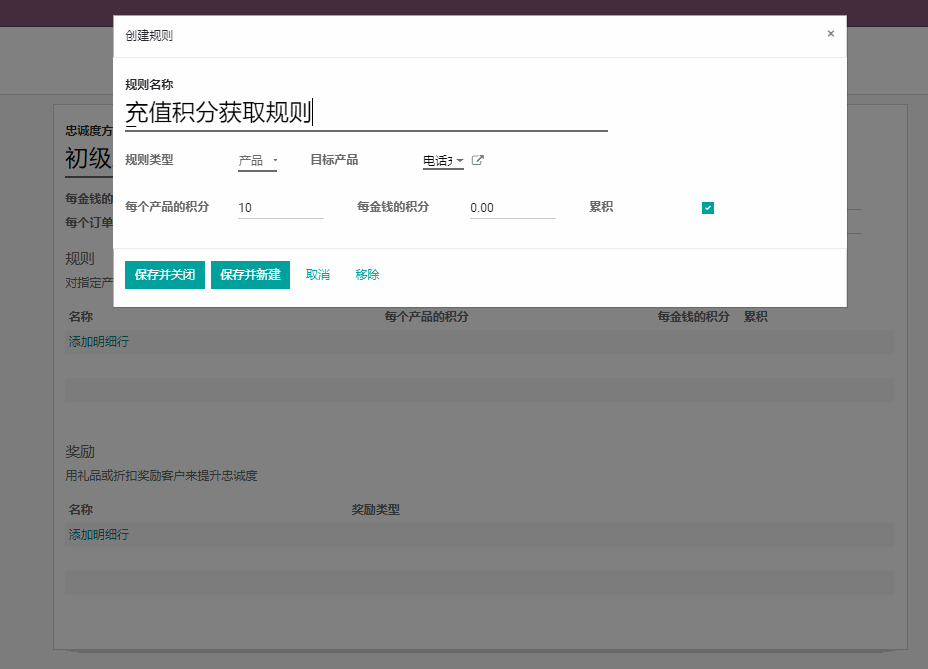 忠诚度方案可根据一类产品或一个产品,进行编辑获取忠诚积分的规则。当有规则且规则为累积时,系统在结算积分时,配置的方案先计算一次积分,再加上规则产生的积分;如规则内不选择累积,则系统在结算积分时,只根据规则计算积分。