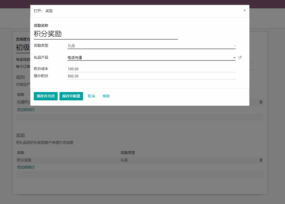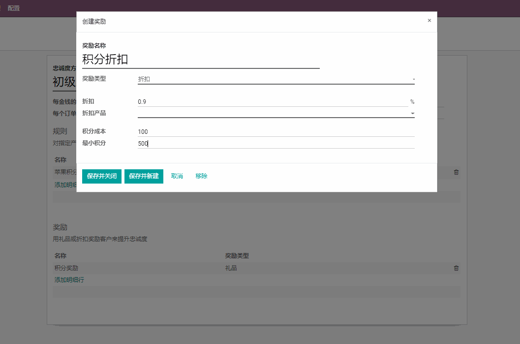 可以对有一定量的忠诚度积分进行奖励。奖励类型有产品和折扣。以下是以积分奖励产品为例。
