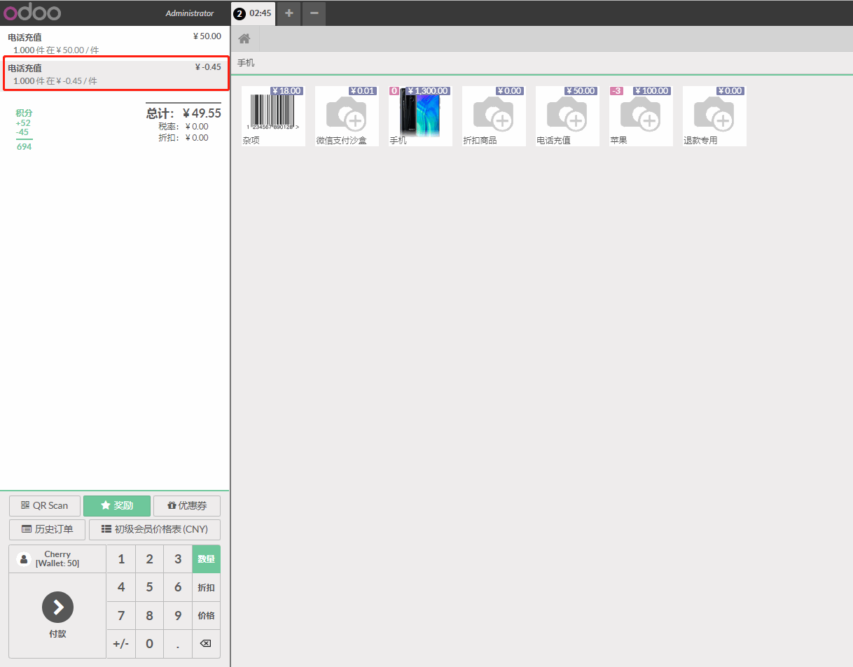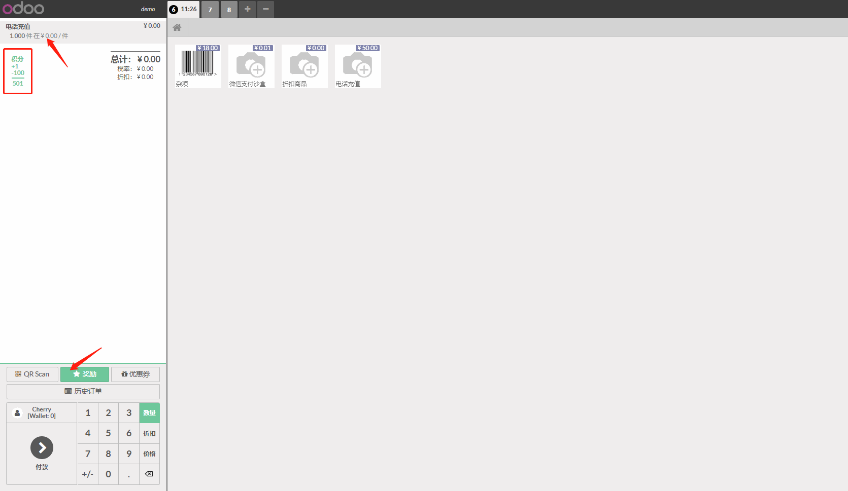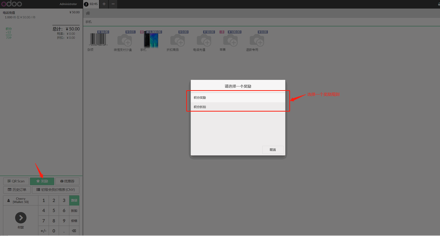 在POS界面中,点击“奖励”按钮,系统会根据当前客户的积分,判断是否满足奖励条件。当前客户满足忠诚度积分条件,系统给予奖励,并扣除相应的积分。