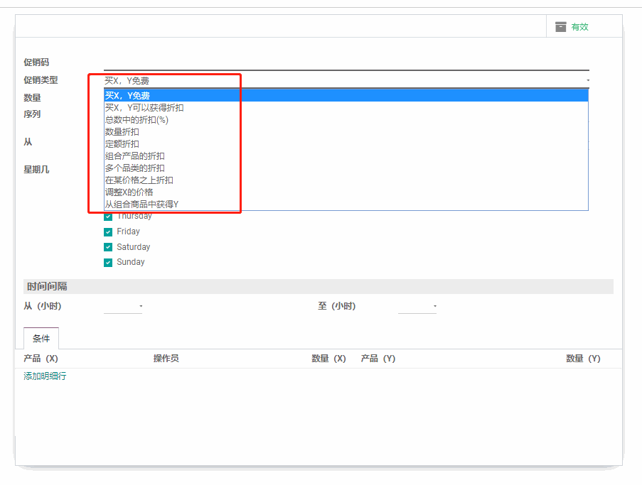 系统支持多种类型的促销活动,选择了某一种促销类型,填写促销条件即可使用。