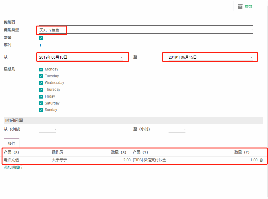 以下以买X送Y为例。设定了促销活动的时间范围,设置当购买产品X大于等于数量X时,赠送产品Y。