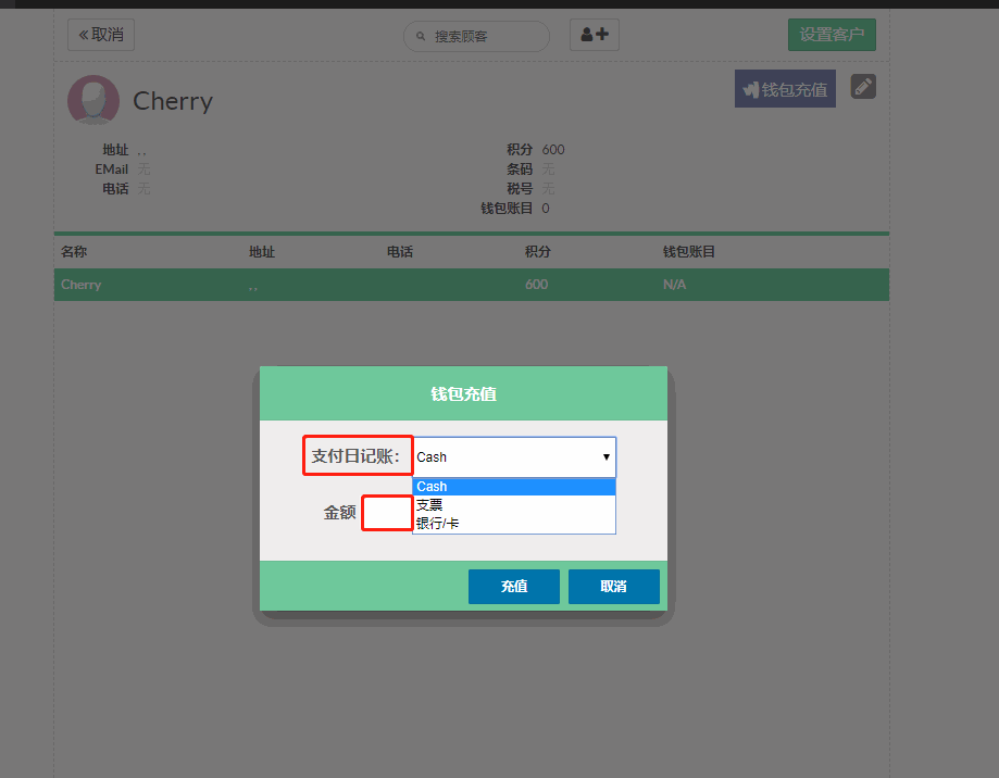配置在pos模块中的付款方式,创建并编辑使用钱包支付的付款方式。必须选“钱包日记账”“在销售中使用“,类型“银行” 默认科目为预收账款