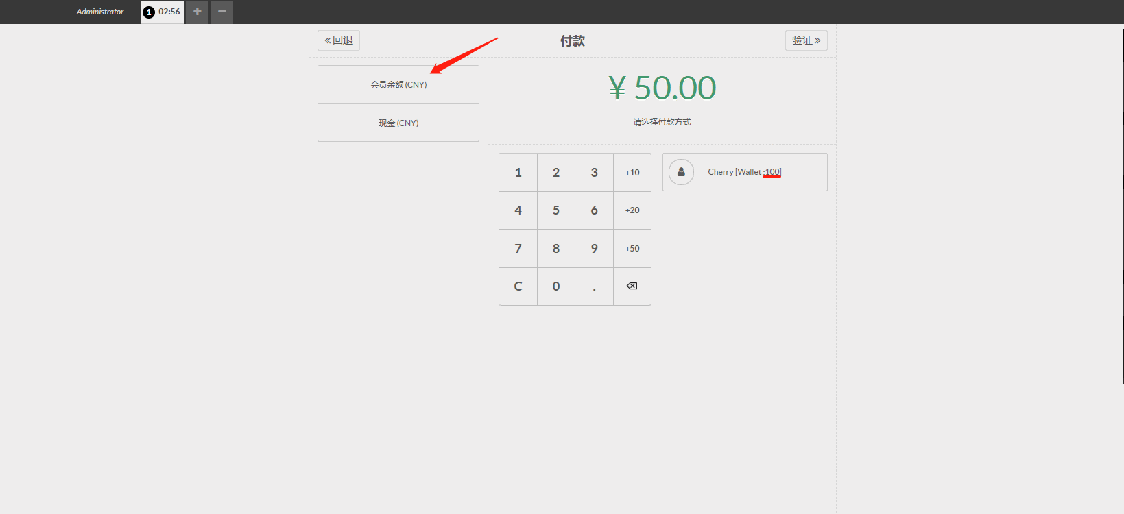 客户在购买商品支付时,在付款界面上,点击新建的付款方式按钮进行支付。在支付界面可以看见客户的wallet的余额。